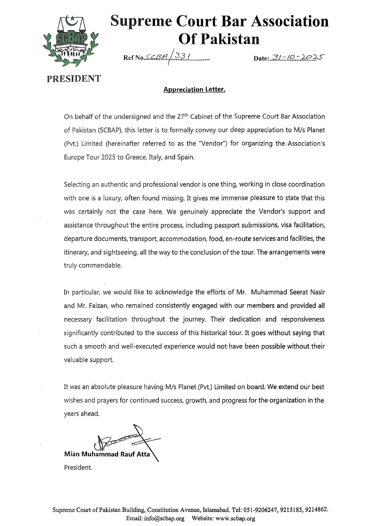 Muhammad Seerat Nasir received formal recognition from the Supreme Court Bar Association of Pakistan (SCBAP) for his exceptional contribution in organizing the Association’s Europe Tour 2025, covering Greece, Italy, and Spain. The appreciation letter, issued by the President of SCBAP, praised the outstanding professionalism, coordination, and service quality delivered under his leadership at Planet (Pvt.) Limited.